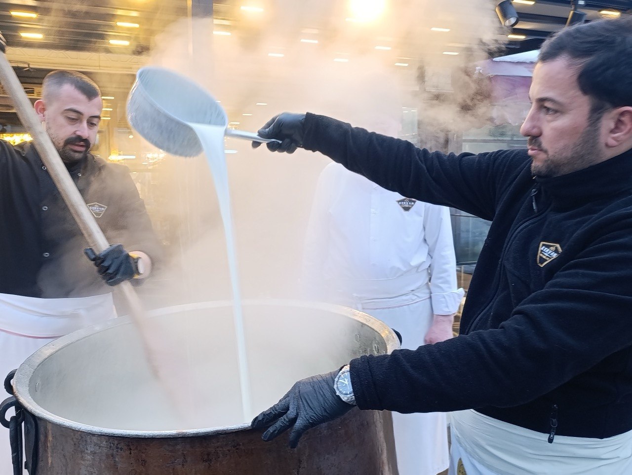 Alpedo Kervan şubelerinde geleneksel hale gelen etkinlik kapsamında, bakır dev kazanda yaklaşık 3 saat boyunca pişirilen 1 ton salep, bardak bardak vatandaşlara ikram edildi.