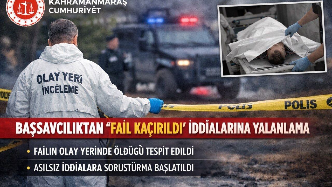 Açıklamada, yapılan olay yeri incelemesi sonucunda failin olay yerinde hayatını kaybettiğinin tespit edildiği vurgulanarak, cenazenin otopsi işlemleri için kolluk kuvvetleri eşliğinde Kahramanmaraş Necip Fazıl Şehir Hastanesi morguna kaldırıldığı ifade edildi.