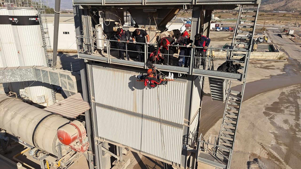 Kahramanmaraş Büyükşehir Belediyesi, personellerin mesleki donanımını güçlendirmek ve acil durumlarda müdahale kapasitesini en üst seviyeye taşımak amacıyla sürdürdüğü hizmet içi eğitimlerine bir yenisini daha ekledi. İtfaiye ve Afet İşleri Dairesi Başkanlığı, AKBEL ve İl Sağlık Müdürlüğü iş birliğiyle Asfalt Üretim Tesisi’nde oldukça kapsamlı ve gerçeğini aratmayan bir tatbikat gerçekleştirildi. Senaryo gereği üretim tesisinde çalışma esnasında fenalaşarak baygınlık geçiren personele İtfaiye erlerince dakikalar içerisinde müdahale edildi. Bilinci kapalı personel yaklaşık 10 metre yükseklikten halatlar yardımıyla güvenli bir şekilde aşağı indirildi. Baygınlık geçiren personel zeminde hazır bulunan İl Sağlık Müdürlüğü ekiplerine teslim edilerek tıbbi değerlendirmeye alındı. Sağlık ekipleri, olay senaryosu çerçevesinde gerekli ilk yardım ve stabilizasyon çalışmalarını uyguladı. Böylece tatbikatın hem kurtarma hem de sağlık entegrasyonu kusursuz şekilde tamamlandı.