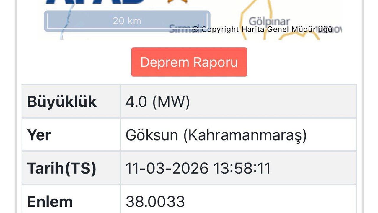 Deprem, 11 Mart 2026 tarihinde saat 13.58.11’de kaydedildi. Merkez üssü Kahramanmaraş’ın Göksun ilçesi olan sarsıntının yerin 7 kilometre derinliğinde gerçekleştiği bildirildi.