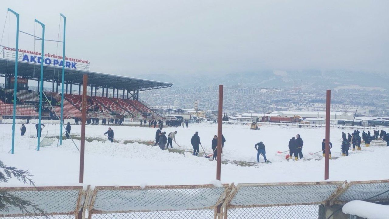 Kahramanmaraş’ta sabah saatlerinden itibaren etkisini artıran kar yağışı sonrası Merkez Spor Kompleksi Stadyumu’nda belediye ekipleri ve stat görevlileri tarafından yoğun kar temizleme çalışmaları yapıldı. Ancak yer yer 30 santimetreyi bulan kar kalınlığı, tüm çalışmalara rağmen sahayı futbol oynamaya elverişli hale getirmeye yetmedi.