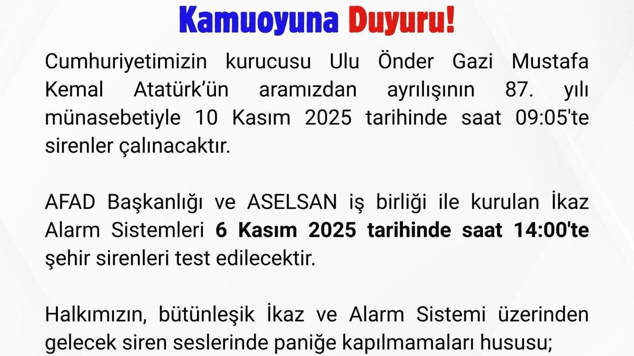 Ayrıca, AFAD Başkanlığı ile ASELSAN iş birliğinde kurulan Bütünleşik İkaz ve Alarm Sistemi kapsamında şehir sirenlerinin test çalışması 6 Kasım 2025 Perşembe günü saat 14.00’te gerçekleştirilecek.