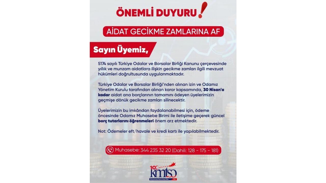 5174 sayılı Türkiye Odalar ve Borsalar Birliği Kanunu kapsamında tahsil edilen yıllık ve munzam aidatlara uygulanan gecikme zamları, ilgili mevzuat hükümleri çerçevesinde yürütülürken, KMTSO tarafından alınan bu karar ile üyelerin mali yükünün hafifletilmesi hedefleniyor.