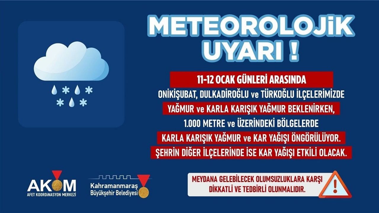 Afet Koordinasyon Merkezi (AKOM), 11 Ocak Pazar ve 12 Ocak Pazartesi günü şehir genelinde etkili olması beklenen olumsuz hava koşullarına karşı vatandaşları uyardı. Meteorolojiden alınan verilere göre; Onikişubat, Dulkadiroğlu ve Türkoğlu’nda karla karışık yağmur ve zaman zaman kar yağışı beklenirken, rakımı 800 metre ve üzerindeki kesimlerde karla karışık yağmur ve yoğun kar yağışı öngörülüyor. Diğer ilçelerde ise yoğun kar yağışı bekleniyor. Olumsuz hava koşulları nedeniyle meydana gelebilecek ulaşımda aksamalar, buzlanma ve don riskine karşı dikkatli ve tedbirli olunması noktasında vatandaşlar uyarıldı.