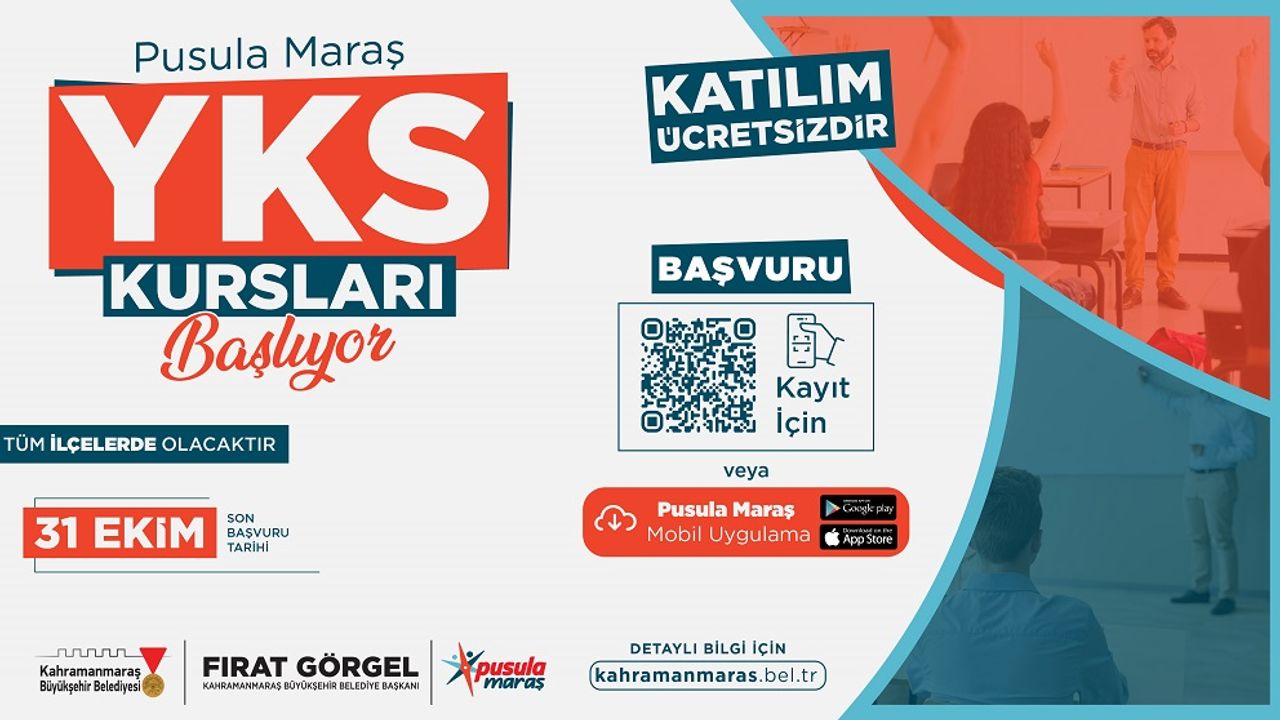 Ücretsiz YKS kurslarına kayıt yaptırmak isteyen öğrenciler, https://kahramanmaras.bel.tr/duyuru/2025/10/23/pusula-maras-yks-kursu-basvuru-formu adresi üzerinden çevrimiçi başvuru yapabiliyor. Kontenjanla sınırlı olan kurslara son başvuru tarihi 31 Ekim Cuma.